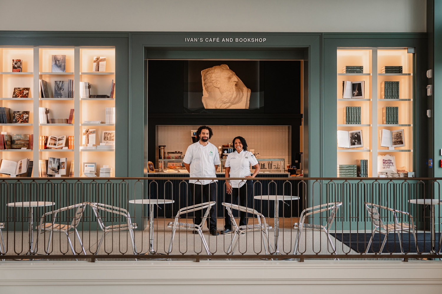 Museum director Joseph Becherer wanted a café in the new space “to make it as inviting as possible,” explains Michael Miller, an assistant director on the campus hospitality team. Museumgoers can take a break while viewing art, lingering over the selves on either side of the café that serve as the museum’s bookshop. During finals week, the café tables spilling out into the atrium were filled with students. “It allows students to be a part of a social part of campus, but also have a quiet place to study,” Miller says.