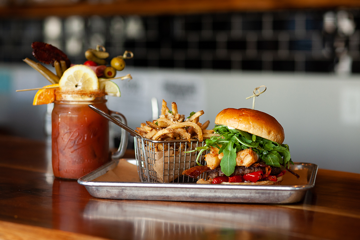 The Urban Legend Bloody Mary comes loaded with bacon, cheese, salami, pickled green beans, olives, pickles, cherry tomatoes and more. Changing specials include the burger of the month; the Taste Bug Burger, which includes apple-smoked bacon and crispy cheese curds, is featured here with a side of Truffle & Parmesan Fries.