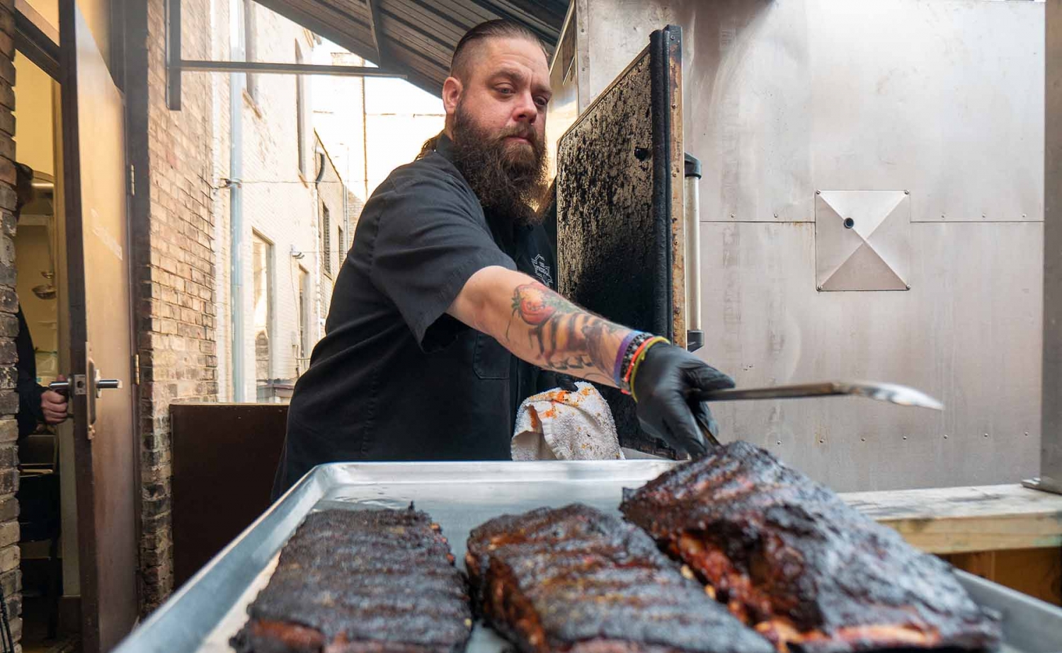 Jeremy Vohwinkle, co-owner of The Prized Pig in Mishawaka, Indiana, places rib tips on a tray as he unloads the smoker behind the restaurant.