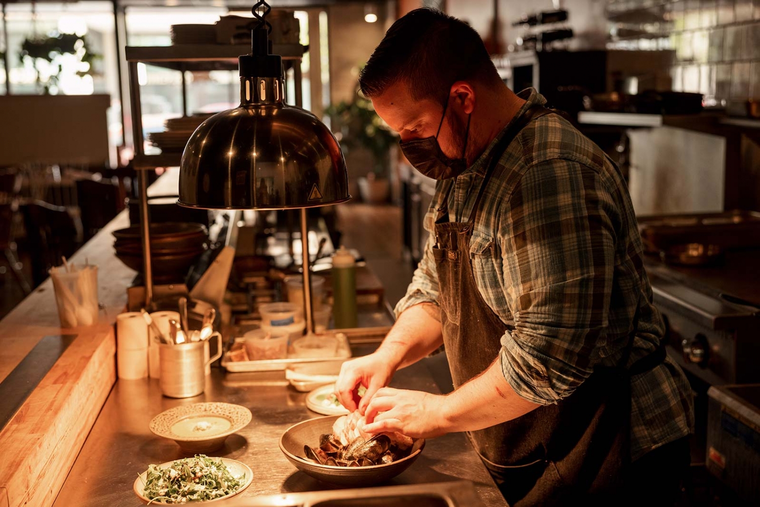 The classic diner layout includes counter and table seats and treats customers to a view of the kitchen, and McParland enjoys cooking near his guests. Sandra has created a casual, welcoming dining room with plants she propagates herself and works by local artists on the walls.