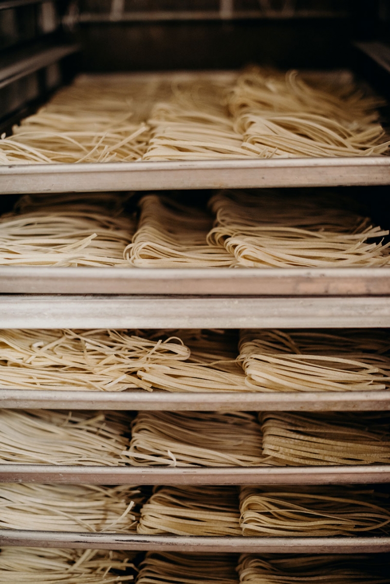 Downstairs in the pasta room, ribbons of house-made dough in various shapes and sizes are rolled out and then carefully laid across wooden racks to dry before being placed on large metal trays and carried up the stairs to be used in such Tosi dinners as lasagna, cannelloni, and hay and straw (green and yellow noodles). Making pasta is a Tosi’s tradition and so is the G. Toresani Co. pasta machine they use. Back in the 1940s, Emil Tosi bought it used in Milan, Italy, carried it back to Stevensville and taught his staff how to use it. It is more than 100 years old.