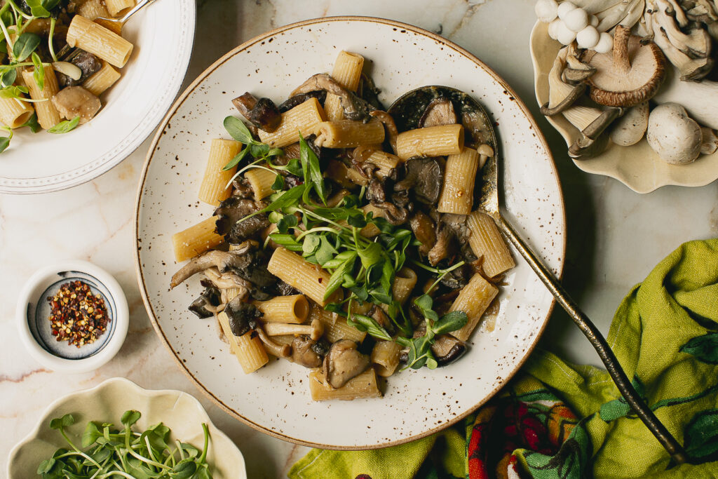 A staple in traditional Japanese cuisine, miso is a thick, salty, fermented soybean paste. Like mushrooms, it’s rich in umami. When cooked together in the same dish, miso and mushrooms amplify each other’s best qualities, resulting in a deeply savory sauce that coats the pasta without feeling too heavy. Tearing the mushrooms rather than chopping them creates an intentional mix of textures, allowing some pieces to crisp up while others stay tender and absorb the sauce. For the best variety of textures, use at least 3 types of mushrooms—shiitake, oyster and lion’s mane make an excellent combination. Don’t forget to toss the shiitake stems into your pasta water for an extra boost of mushroom flavor.