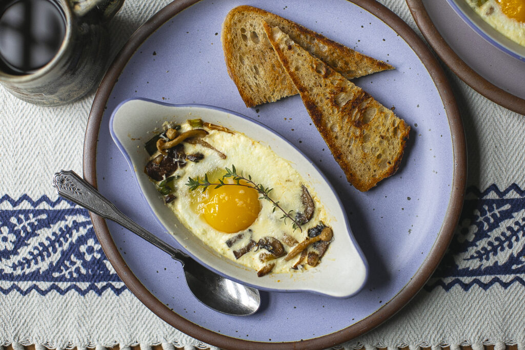 Shirred eggs, or baked eggs, are based on the classic French technique of oeufs en cocotte. The English name comes from the shallow, oven-safe vessel they were traditionally prepared in, called a shirrer. The eggs are baked gently with simple additions like a splash of cream, a sprinkle of Parmesan and sautéed vegetables. The result is a tender egg white and softly set yolk, perfect for scooping up with toasted bread and serving as an easy yet satisfying breakfast or brunch dish. In this version, earthy mushrooms and sweet leeks are used to create a savory base. Use any mushroom variety you’d like, but when in doubt, use cremini.