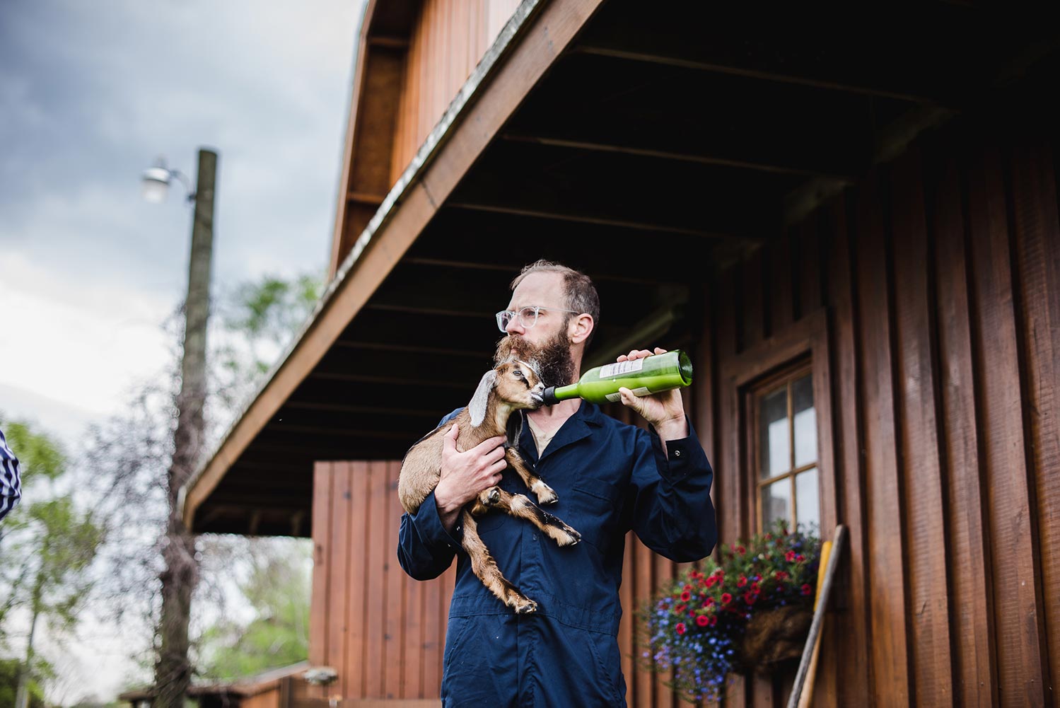 Joshua Barnhart bottle feeds a baby Nubian goat to help get her used to interacting with humans. Barnhart is partnering with the Klinedinsts on a new regional wholesale cheese distribution company, Cheese Savors.