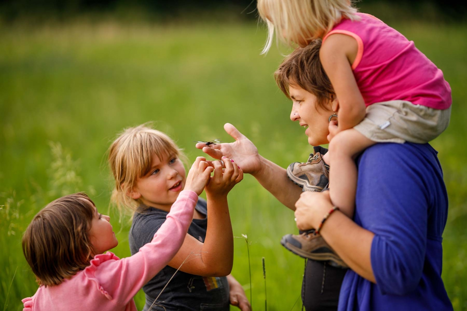Maya Turner, Lilly Boener and Violet Boener look on with curiosity at the dragonfly perched on Amanda Jo Boener’s finger