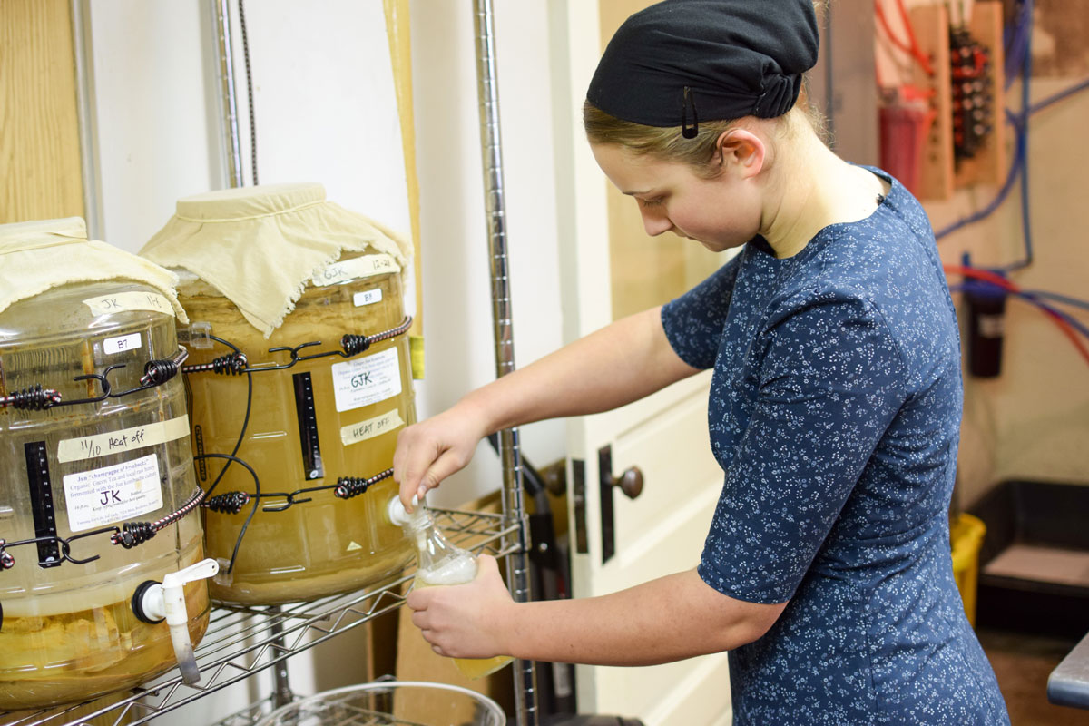 Photo 1: Alaura Nutt fills bottles with kombucha. Farming for Life adds tea and sugar to the giant jars for continuous fermentation.