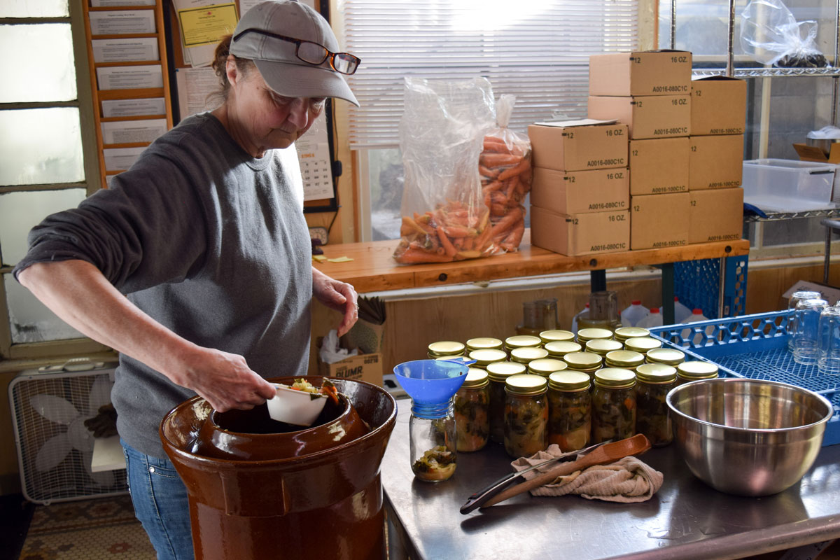 Photo 1: Michele Yazel fills jars with some of Farming for Life’s flavorful and spicy kimchi made by fermenting vegetables in crocks.