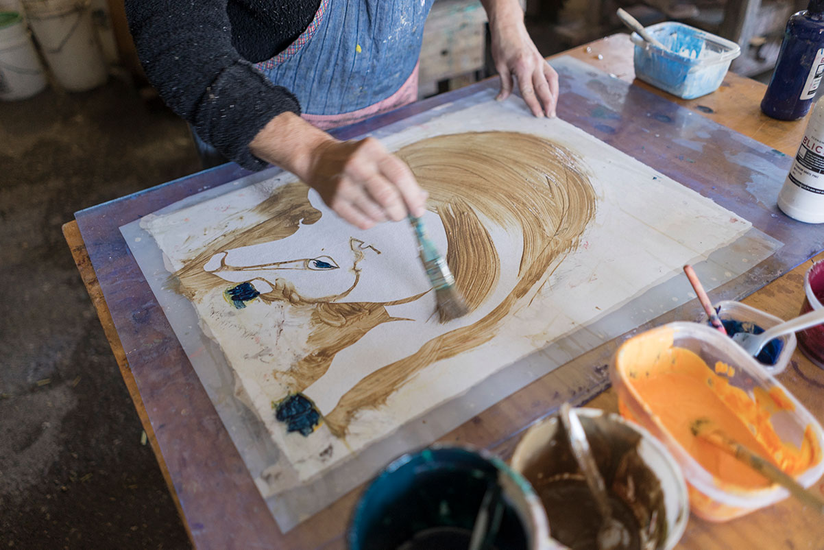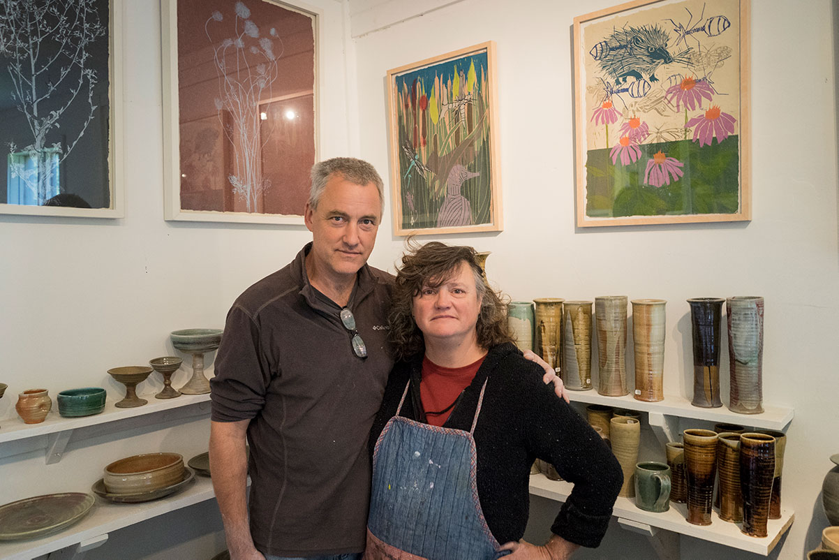 And for patrons who travel to the studio, an art piece’s journey is as important to understand as the item itself. Slip a piece of handmade paper from Peterson’s drawer of works and you could be holding the threadbare blue jeans from a neighboring farmer. Clasp a mug thrown on Hook’s wheel and you might be clutching Queen Anne’s lace from across the street.