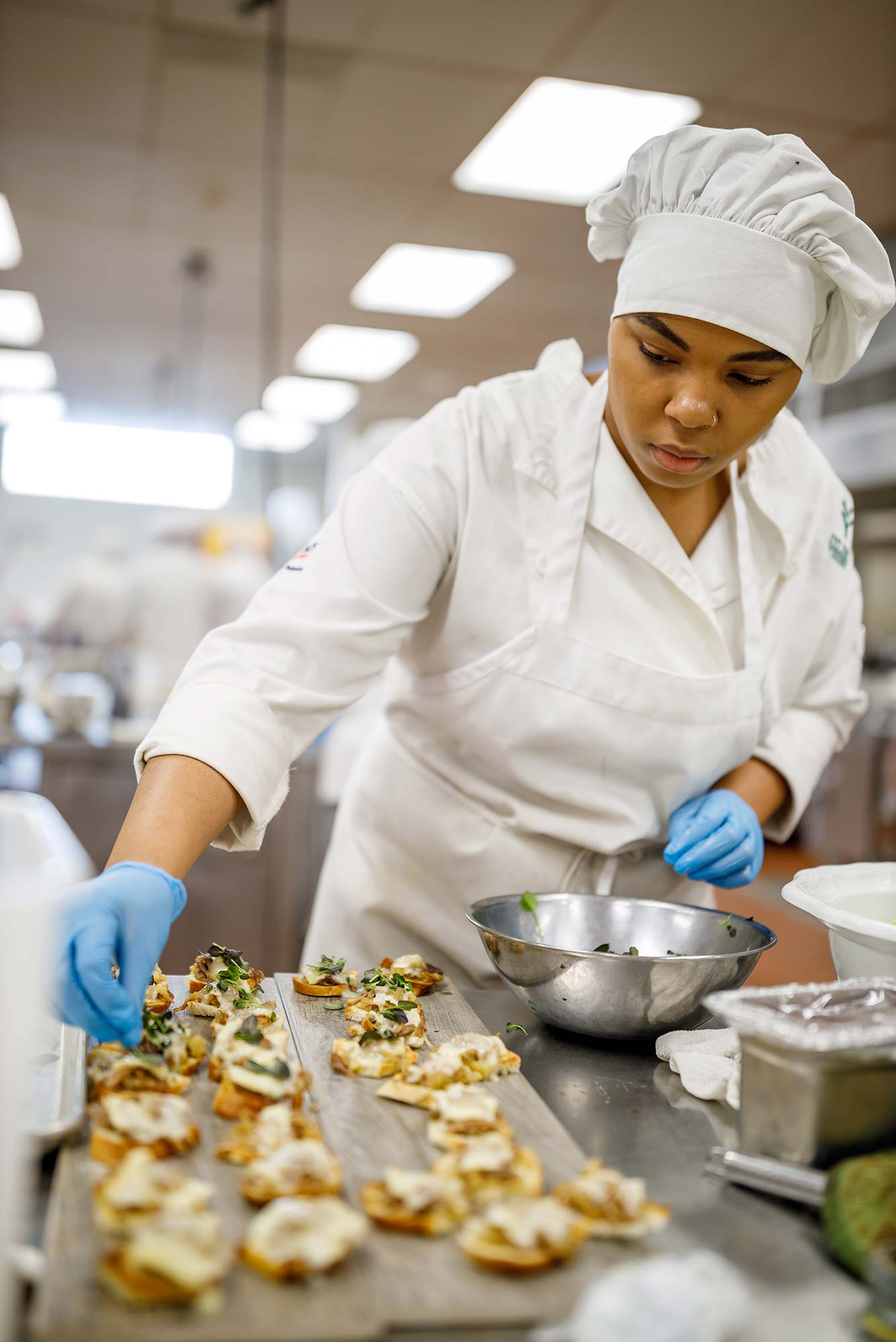 Jada Graham, a Culinary Arts student at Ivy Tech Community College in South Bend, IN, plates one of the offerings for a group dinner at the end of the fall semester.