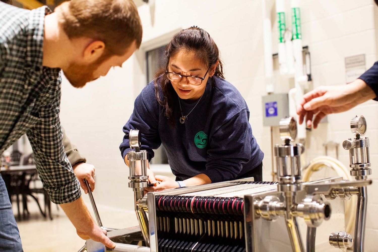 Daniel Berghoff and Kyla Evens prepare a plate and frame filter press during a Wine and Viticulture class at Lake Michigan College in Benton Harbor, MI.